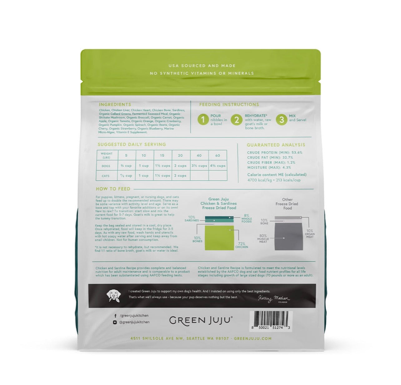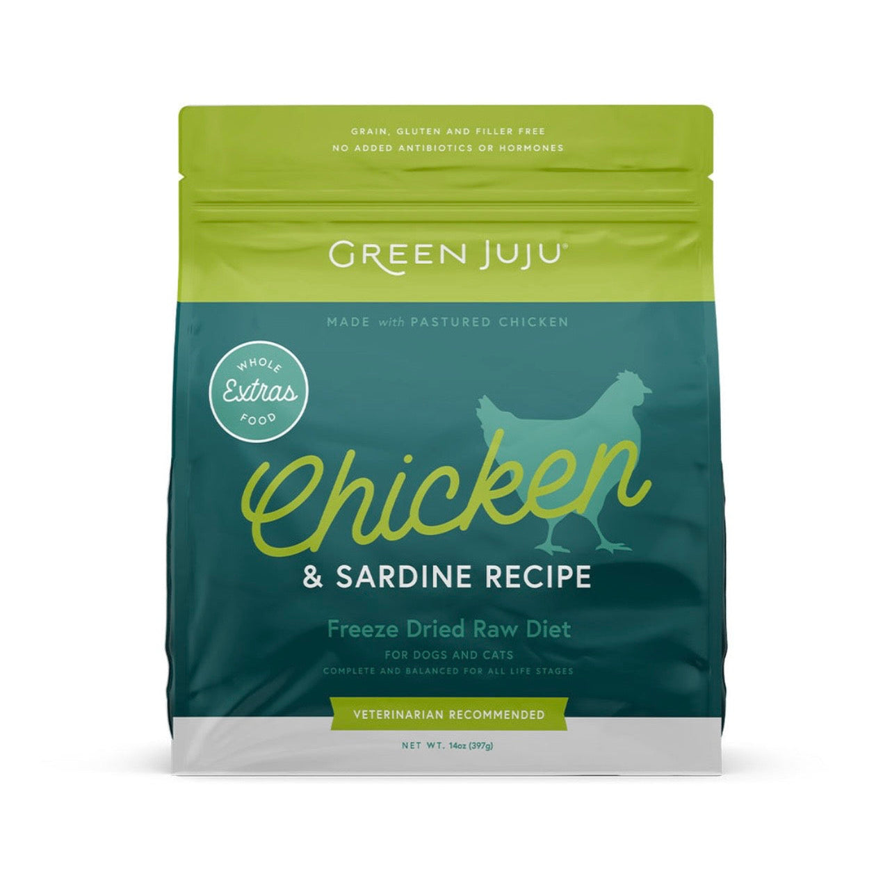 Green Juju Chicken & Sardine Recipe provides complete and balanced nutrition for adult maintenance and is comparable to a product which has been substantiated using AAFCO feeding tests.