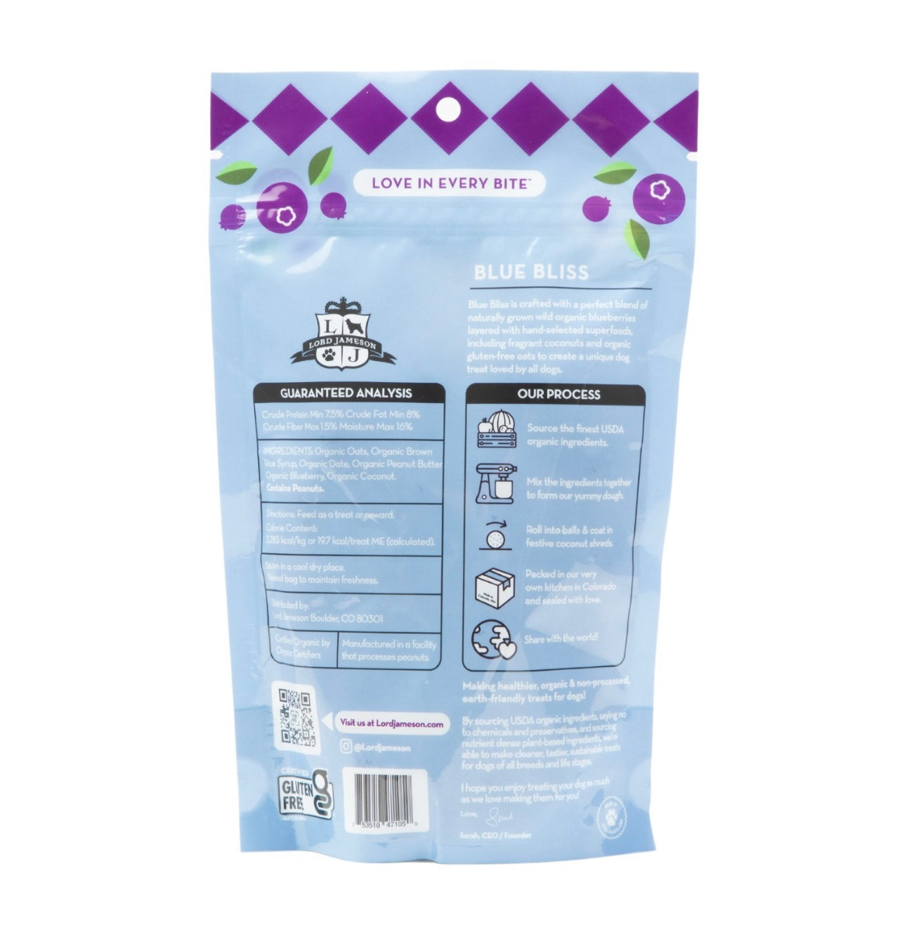 Blue Bliss is crafted with a perfect blend of naturally grown organic blueberries layered with hand-selected superfoods, including fragrant coconuts and organic gluten-free oats to create a unique dog treat loved by all dogs.